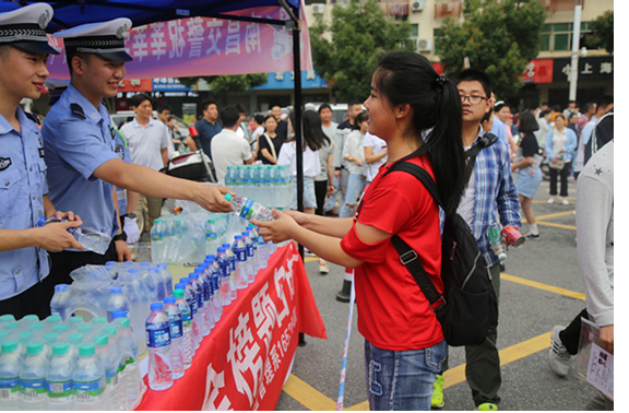 此次服务小队主要有1652中队学生组成,小队分成两组,一组在考场外设立爱心服务点,为参加高考的考生和家长送去爱心饮用水,带去防暑降温的药品。另外一组配合当地交警维护考场周围交通秩序,确保送考生的车辆能够顺利到达考场,给广大考生创造一个安全,有序,畅通的考试环境。